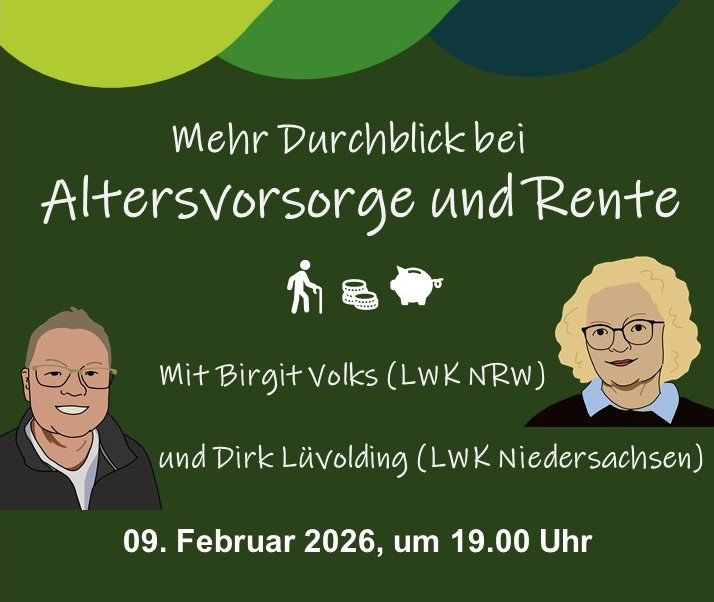 Die Deutsche Rentenversicherung bildet für viele Arbeitnehmende die zentrale Säule der Altersvorsorge. Birgit Volks (LWK NRW) und Dirk Lüvolding (LWK Nds.) stellen vor, wie Sie Ihre Rentenansprüche besser nachvollziehen und gezielt verbessern können. Dafür werden zentrale Begriffe wie Renteninformation, Wartezeit, Kontenklärung und Frührente verständlich erläutert. Es wird die digitale Rentenübersicht vorgestellt, mit der man sich schnell einen Überblick über die persönlichen Rentenansprüche verschaffen kann.