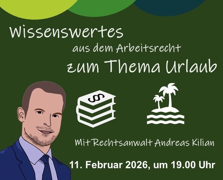 Das Thema Urlaub umfasst vielfältige Fragen: Verfall von Urlaub, Urlaubsanspruch im Minijob, Einfluss auf den Urlaubszeitraum, Probleme mit genehmigtem und gebuchtem Urlaub, Erreichbarkeit und Krankheit im Urlaub sowie Arbeiten in der Urlaubszeit sind einige davon. In seinem Vortag gibt Rechtsanwalt Andreas Kilian (VLF) Antwort auf verschiedene Fragen zum Urlaub und geht dabei auch auf aktuelle Rechtsprechung ein. Ihren Platz finden außerdem Informationen über Bildungsurlaub und Freistellungen für Fortbildung und Ehrenamt.