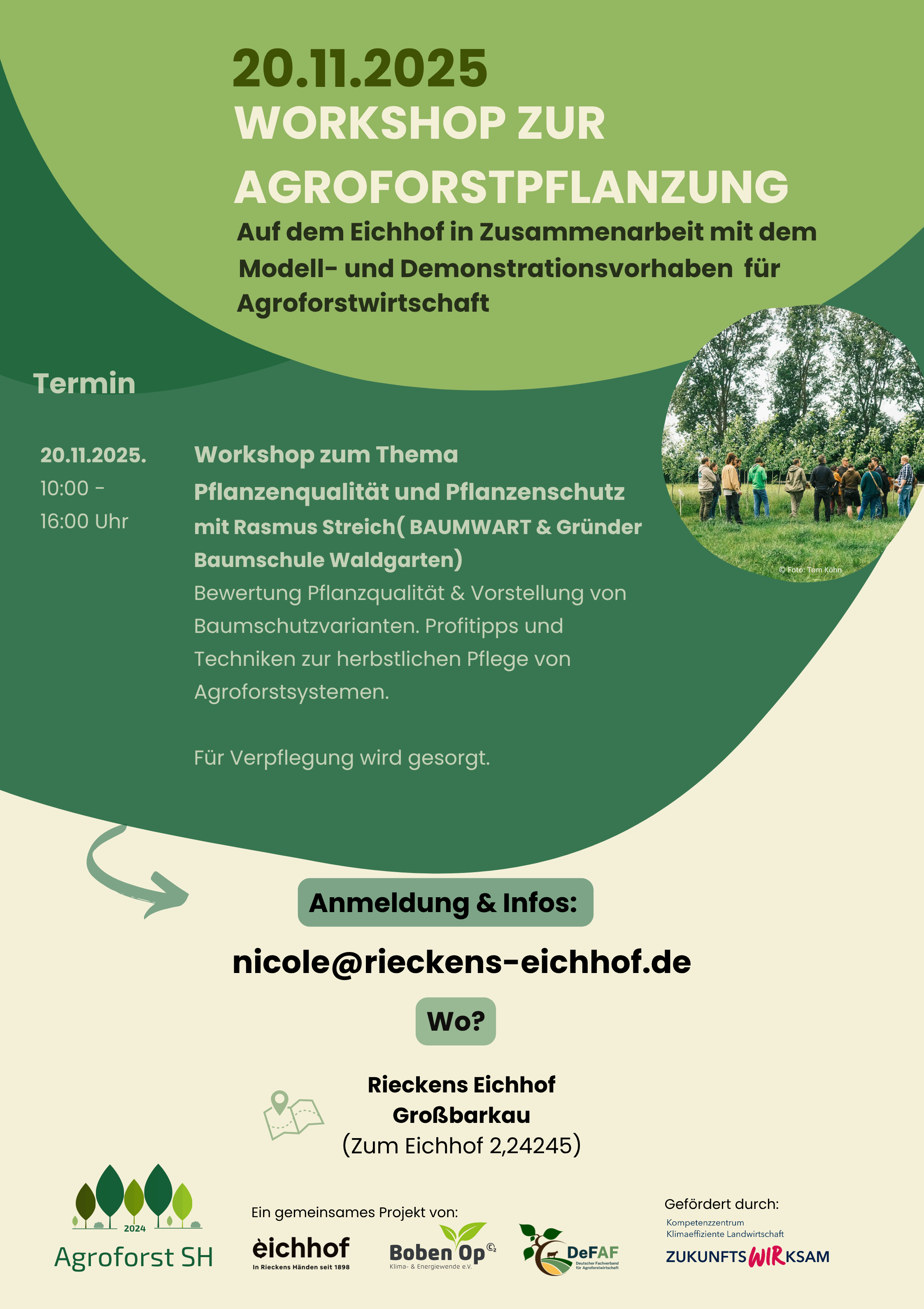 herzlich möchten wir Euch zu unserem nächsten Workshop mit dem Thema Pflanzen und Baumschutz im Agroforst einladen am Donnerstag, 20.11.2025 von 10 – 16 Uhr mit Rasmus Streich von der Baumschule Waldgarten und Felix Riecken vom Eichhof einladen. Was ist wichtig bei der Pflanzung zu beachten? Welche Dinge gibt es beim Baumschutz zu beachten und wie erkenne ich gute Pflanzqualität bei meinen Gehölzen? All diesen Fragen und vielen mehr wollen wir uns nächste Woche bei dem Workshop widmen! Melde dich an und komme vorbei!