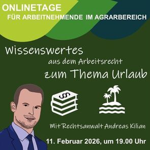Die Arbeitnehmerberatungen der Landwirtschaftskammern organisiert seit 2021 die Agrar Onlintetage für Arbeitnehmende. Dieses Jahr haben diese am 18.02.2025 mit dem Thema "Aktuelle Themen aus dem Arbeitsrecht" und am 20.02.2025 mit dem Thema "Psychische Belastung am Arbeitsplatz" stattgefunden.