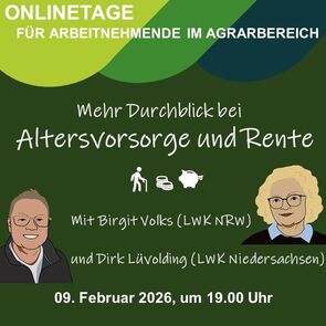Die Deutsche Rentenversicherung bildet für viele Arbeitnehmende die zentrale Säule der Altersvorsorge. Birgit Volks (LWK NRW) und Dirk Lüvolding (LWK Nds.) stellen vor, wie Sie Ihre Rentenansprüche besser nachvollziehen und gezielt verbessern können. Dafür werden zentrale Begriffe wie Renteninformation, Wartezeit, Kontenklärung und Frührente verständ-lich erläutert. Es wird die digitale Rentenübersicht vorgestellt, mit der man sich schnell einen Überblick über die persönlichen Rentenansprüche verschaffen kann.