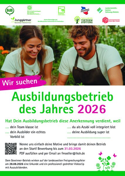 In den Ausbildungsberufen Landwirt und Landwirtin sowie Gärtner und Gärtnerin zeichnen die Landwirtschaftskammer Schleswig-Holstein und die Berufsverbände die Ausbildungsbetriebe, die sich durch ihr außergewöhnliches Engagement und herausragende Ausbildungsleistungen hervorgetan haben, aus.