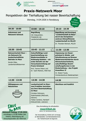 Die Landwirtschaftskammer ist derzeit dabei, mit Förderung des Kompetenzzentrums klimaeffiziente Landwirtschaft ein Netzwerk Moor aufzubauen. Hierzu ein Poster mit weiteren Informationen. Das Netzwerk soll als Kommunikationsformat dienen, um den Austausch unter Landwirten, die Moor-/Niederungsflächen bewirtschaften, der Forschung und Beratung zu ermöglichen. Weitere Ziele sind Fachinformationen zu liefern, zu aktuellen Projekten und Veranstaltungen zu informieren, Einblicke in andere Projekte zu ermöglichen, aber auch um praxisrelevante Ideen und Fragestellungen zu entwickeln und zu begleiten. 2026 sind für das Netzwerk eine Moorkonferenz, drei Feldtage und eine Exkursion in ein Moorprojekt angedacht.